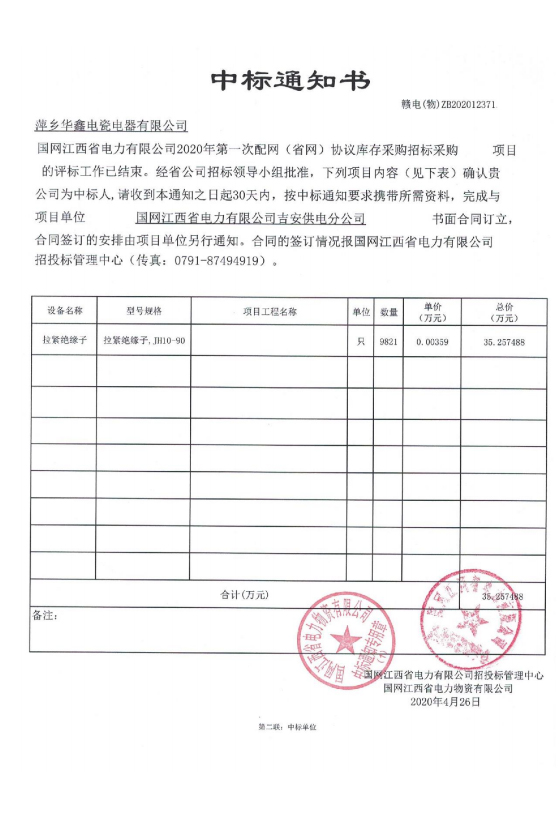 中标通知书 赣电(物)ZB202012371